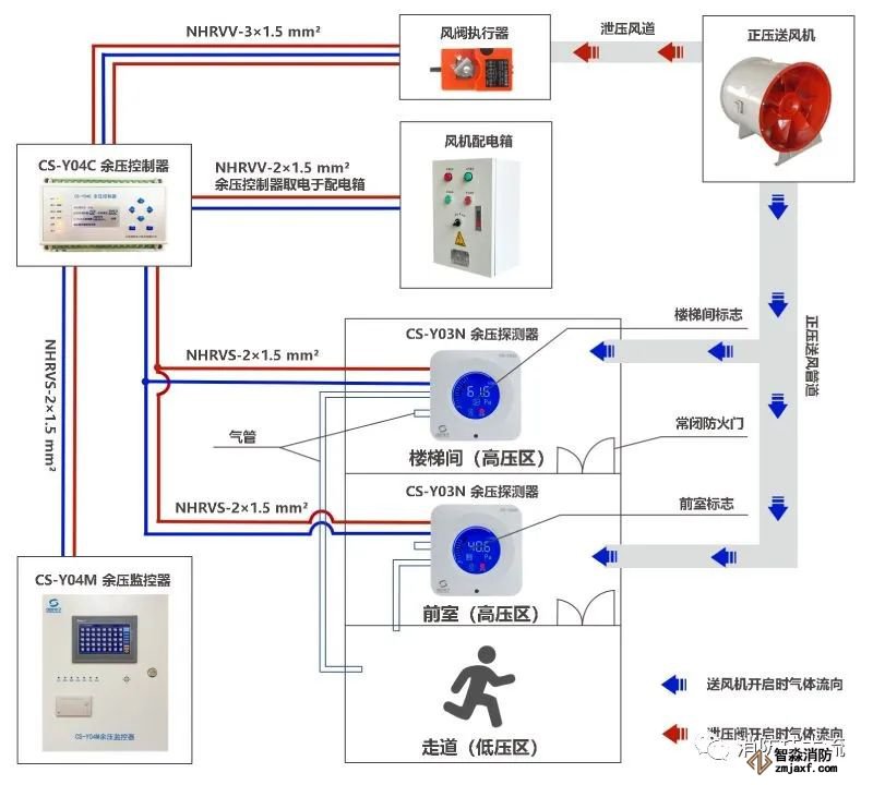 3、余壓控制器(箱)由風(fēng)機(jī)配電箱供電,負(fù)責(zé)給余壓探測(cè)器和泄壓閥執(zhí)行器供電,它的安裝教程可以參考《CS-Y04C余壓控制器安裝及圖解》。