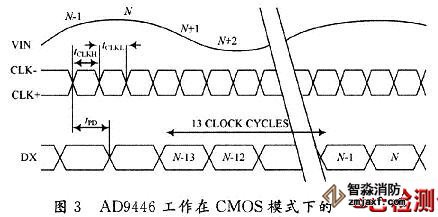 AD9446芯片的控制時(shí)序與傳統(tǒng)的低速A/D有所不同,它完全依靠時(shí)鐘來(lái)控制其采樣、轉(zhuǎn)換和數(shù)據(jù)輸出。AD9446通常在CLK第一個(gè)時(shí)鐘的上升沿開(kāi)始采樣轉(zhuǎn)換,并在經(jīng)過(guò)延遲tpd后,開(kāi)始輸出數(shù)據(jù)。而數(shù)據(jù)則在第13個(gè)時(shí)鐘到來(lái)時(shí)才出現(xiàn)在D15~D0端口上。圖3是AD9446工作在CMOS模式下的時(shí)序圖。