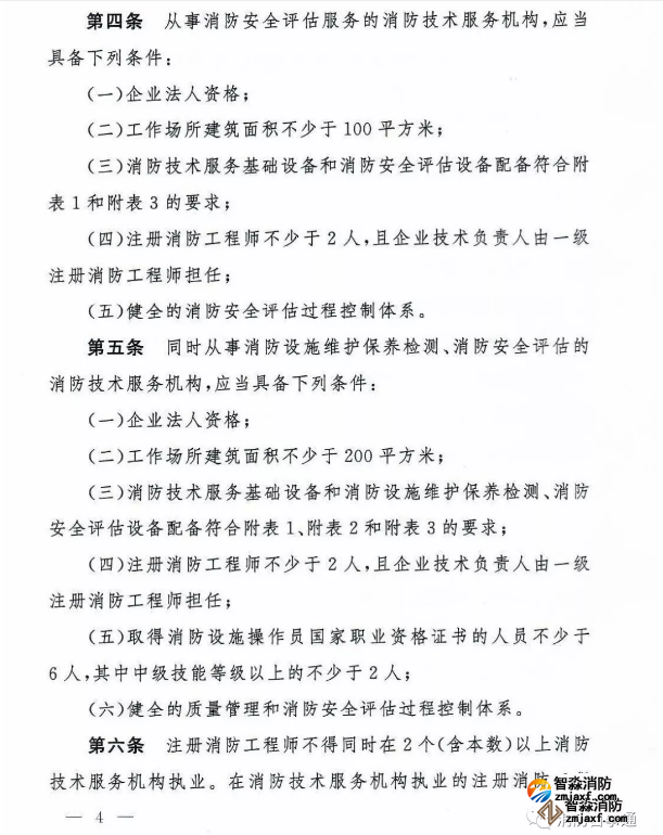 第五條 同時(shí)從事消防設(shè)施維護(hù)保養(yǎng)檢測(cè)、消防安全評(píng)估的消防技術(shù)服務(wù)機(jī)構(gòu),應(yīng)當(dāng)具備下列條件: