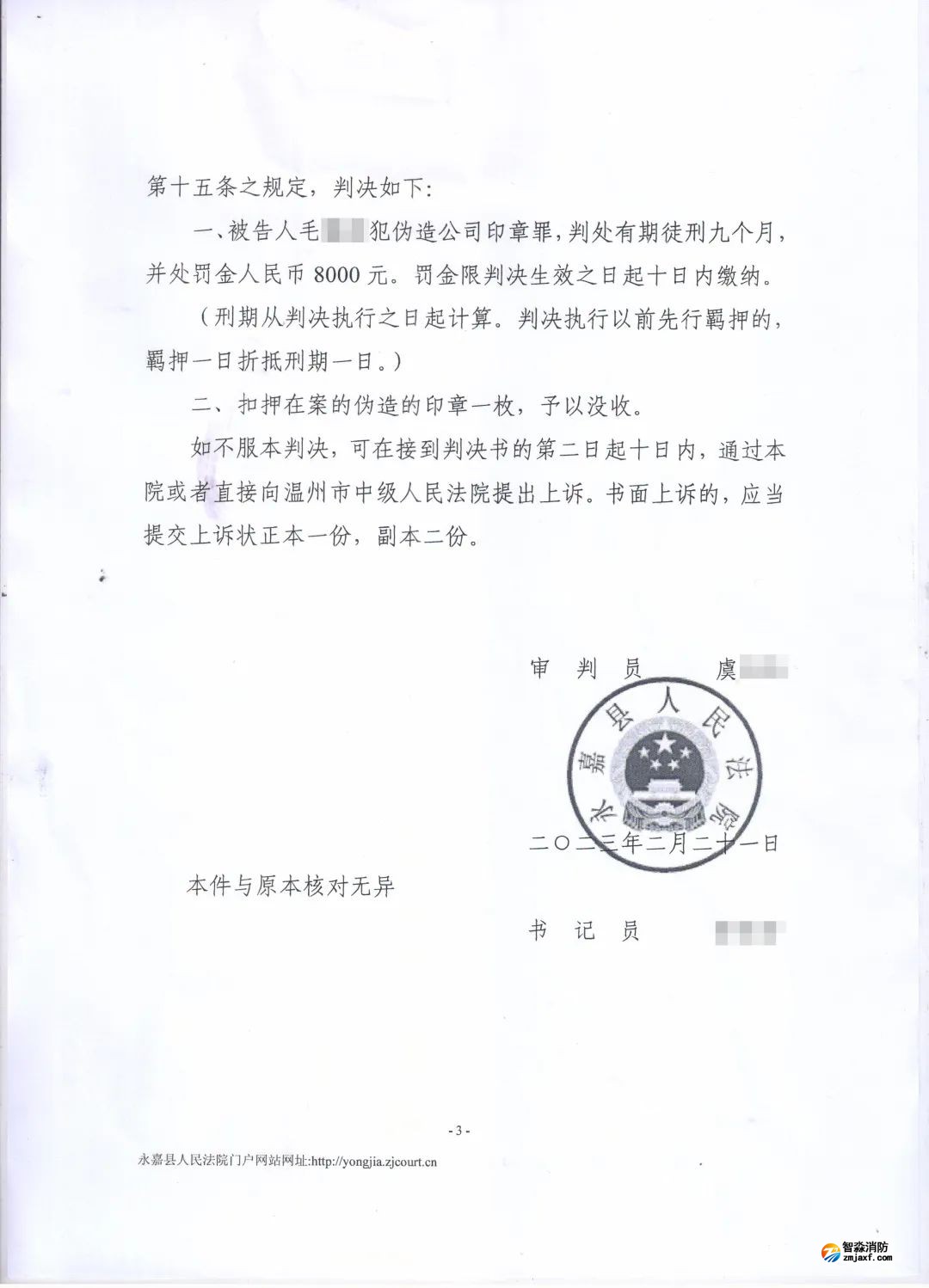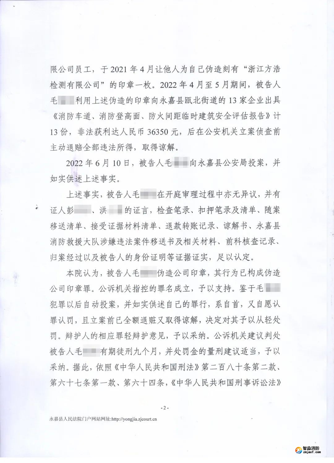 2023年2月21日永嘉縣人民法院對(duì)毛某偽造其所任職的消防技術(shù)服務(wù)機(jī)構(gòu)的公司印章,出具虛假消防檢測(cè)報(bào)告一案予以判決,當(dāng)事人毛謀因犯?jìng)卧旃居≌伦锉慌刑幱衅谕叫叹艂€(gè)月并處罰金人民幣8000元。