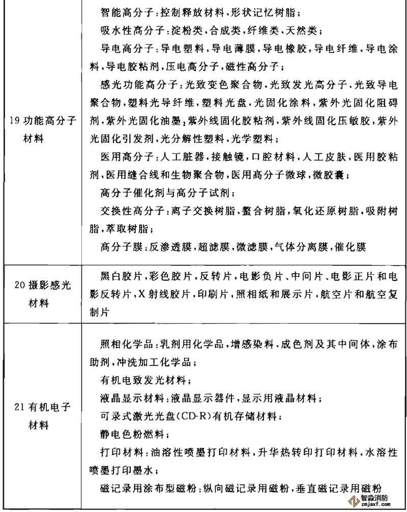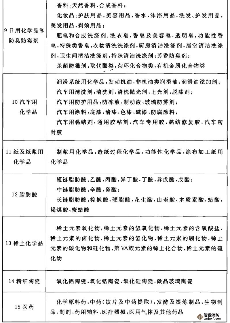 關(guān)于精細(xì)化工產(chǎn)品分類(lèi),上海市工程建設(shè)規(guī)范《精細(xì)化工企業(yè)設(shè)計(jì)防火規(guī)范》DGJ 08-2133將精細(xì)化工產(chǎn)品分為十五大類(lèi):農(nóng)藥、染料、涂料(包括油漆和油墨)、顏料、試劑和高純物、信息用化學(xué)品(包括感光材料、磁性材料等能接受電磁波的化學(xué)品)、食品和飼料添加劑、黏合劑、催化劑和各種助劑、化學(xué)藥品(原料藥)和日用化學(xué)品、高分子聚合物中的功能高分子材料(包括功能膜、偏光材料等)、微電子化學(xué)品、生物化工制品(生物技術(shù)藥物、診斷試劑、化學(xué)藥物)、太陽(yáng)能光伏光熱化學(xué)品、新材料(高性能膜材料、特種玻璃、功能陶瓷)等。