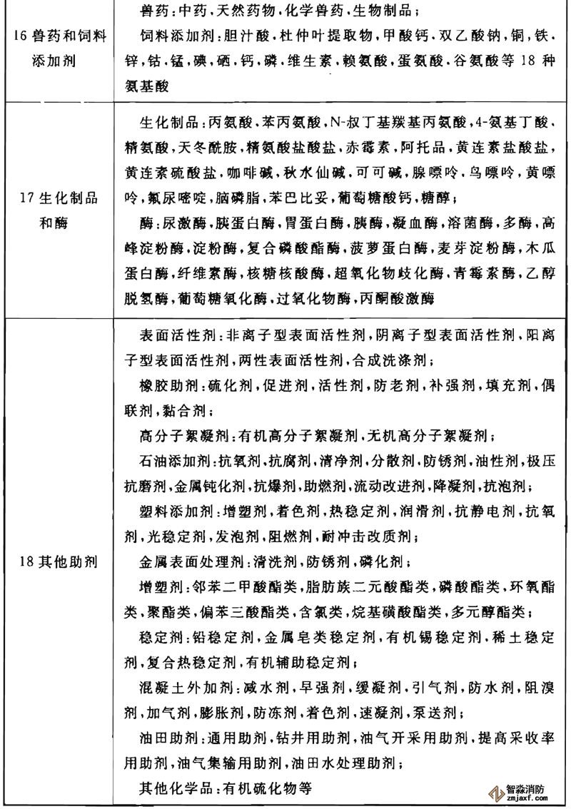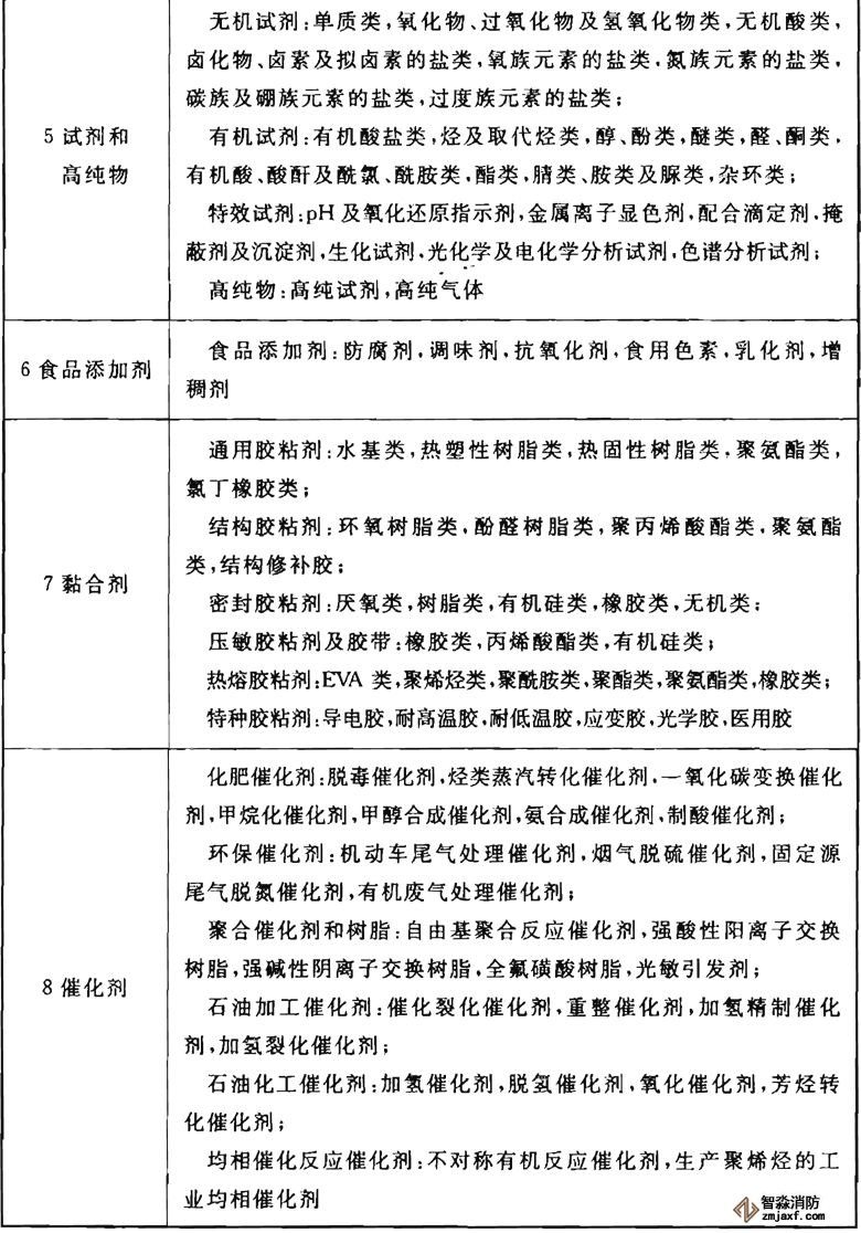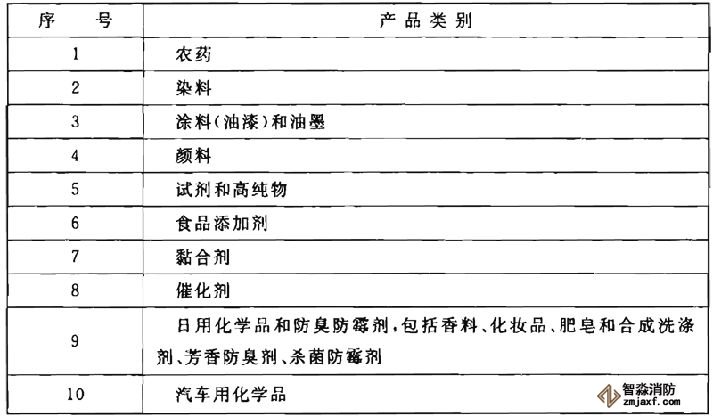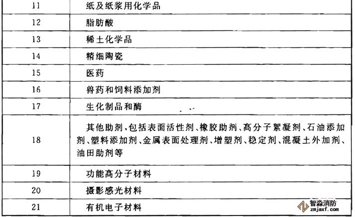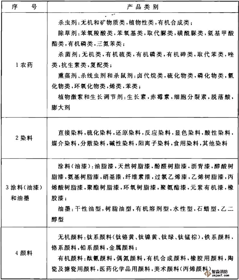 表1是在上海市工程建設(shè)規(guī)范《精細(xì)化工企業(yè)設(shè)計(jì)防火規(guī)范》DGJ 08的基礎(chǔ)上,參照日本1990年精細(xì)化工產(chǎn)品分類(lèi),并結(jié)合我國(guó)精細(xì)化工產(chǎn)品品種的發(fā)展制定的。