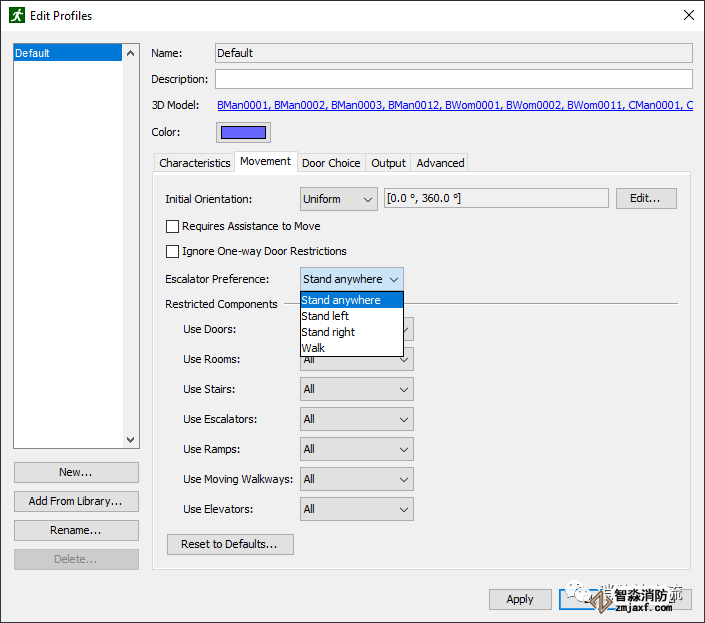 舊版的Pathfinder模擬扶梯時(shí)(escalators)人員在扶梯上的狀態(tài)只能是行走(Walk),而新版本的Pathfinder增加扶梯上人員的狀態(tài)選項(xiàng),人員可以在扶梯上站立(Stand)也可以行走(Walk),并且可以選擇人員在扶梯上站立的位置,包括靠左站立、靠右站立和站立在任意位置,該功能的增加無疑使疏散模擬情景更接近實(shí)際。